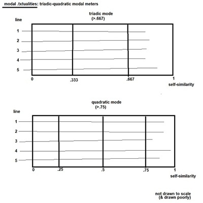 The section or sentence is a “self-similar line”, and the text is a “self-similar wave”, both of which come into being via measurement. The measurement defines the “mode” — a quotient range (>.667; .650-.800, etc) is just a variable restriction, like a mode.
